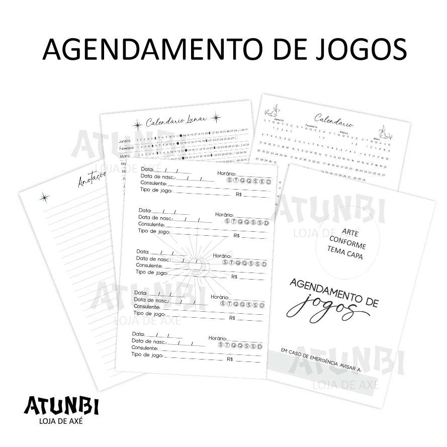 Agendamento de Jogos, capa e contra-capa dura e laminada, encadernação wire-o, saco canguru plástico, passante, fechamento com elástico, totalizando 240 páginas.