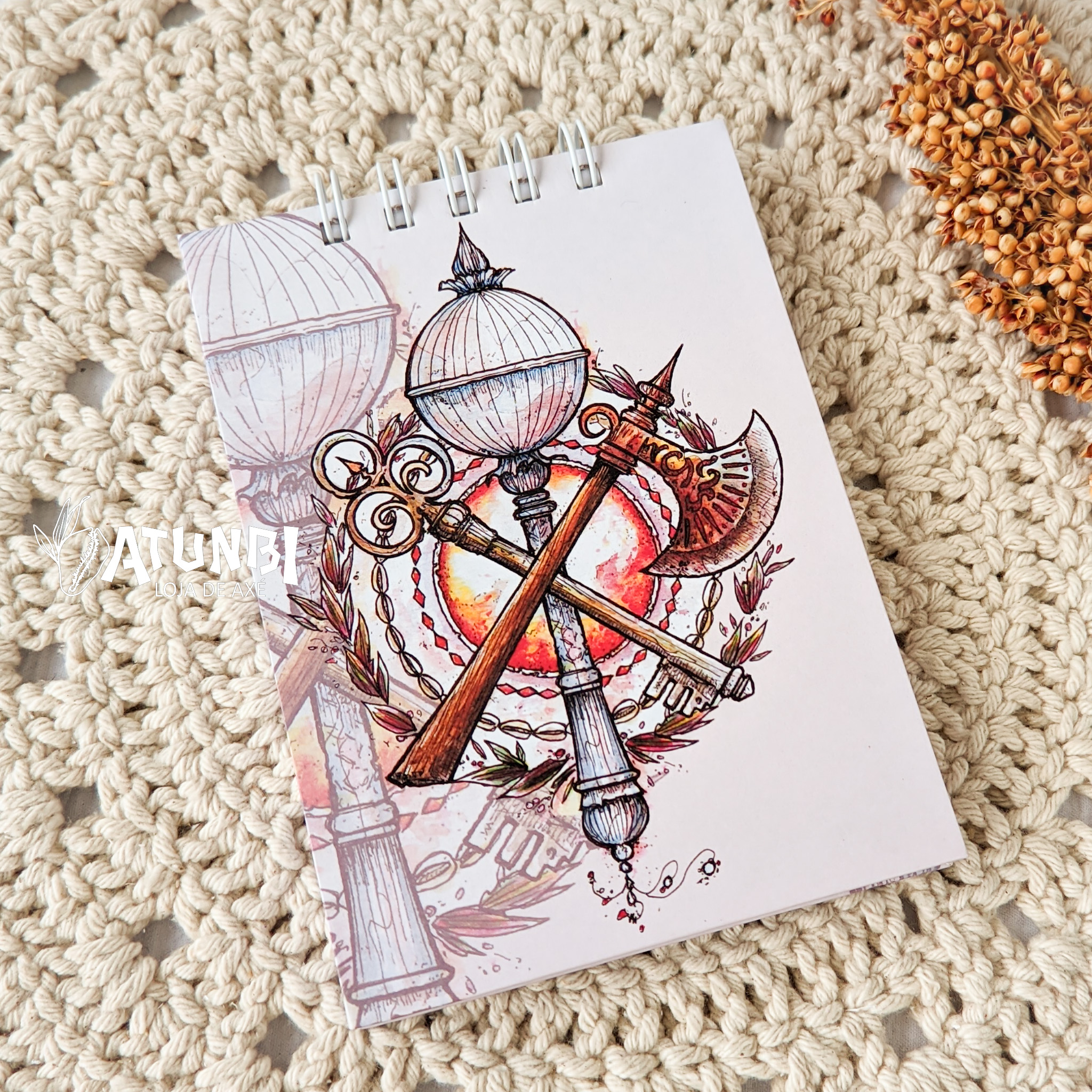 Bloco personalizado encadernado com wire-o contendo 70 folhas brancas de 75g em capa e contracapa dura laminada.