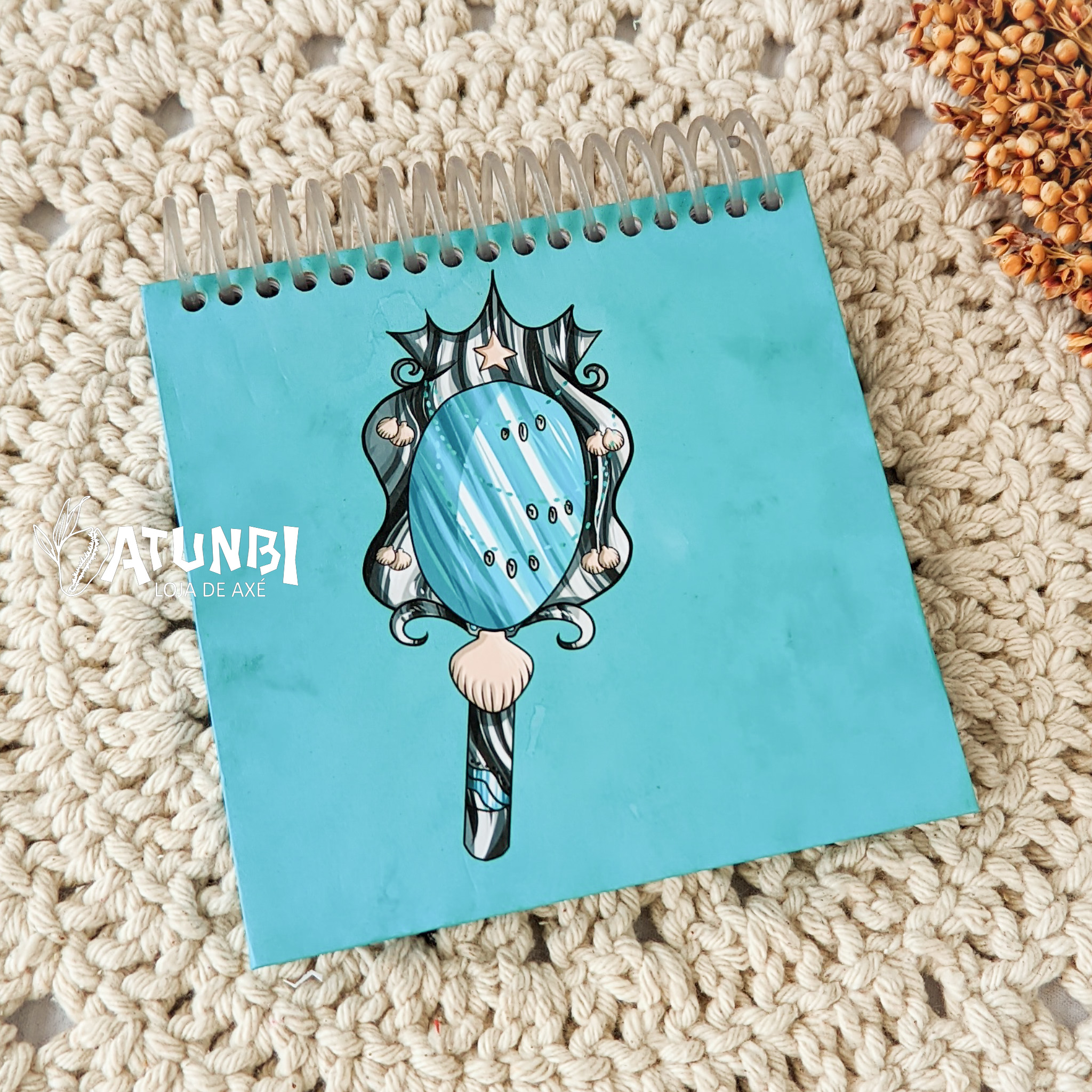Bloco personalizado encadernado com espiral contendo 70 folhas brancas de 75g em capa e contracapa dura laminada.
