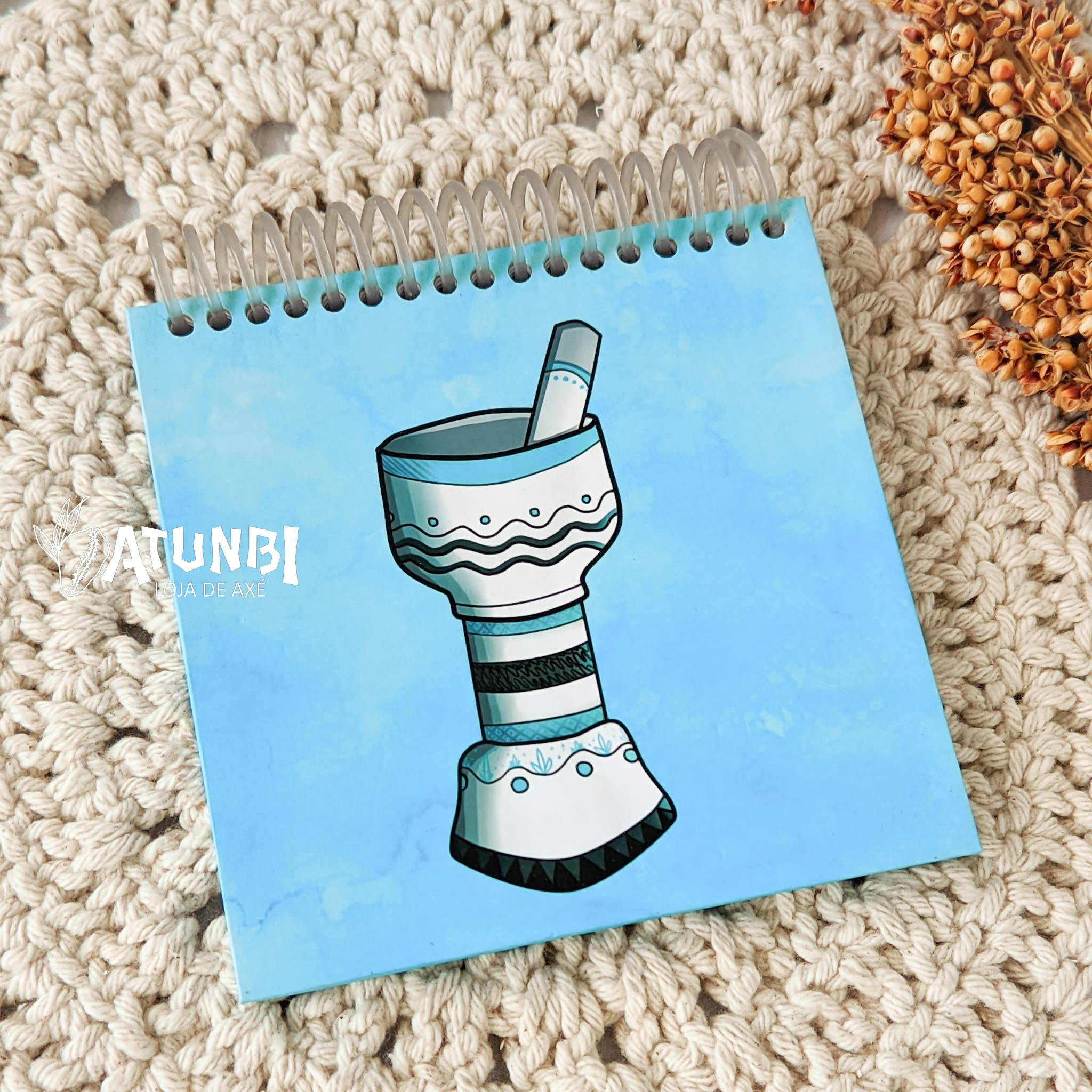 Bloco personalizado encadernado com espiral contendo 70 folhas brancas de 75g em capa e contracapa dura laminada.