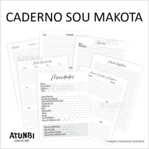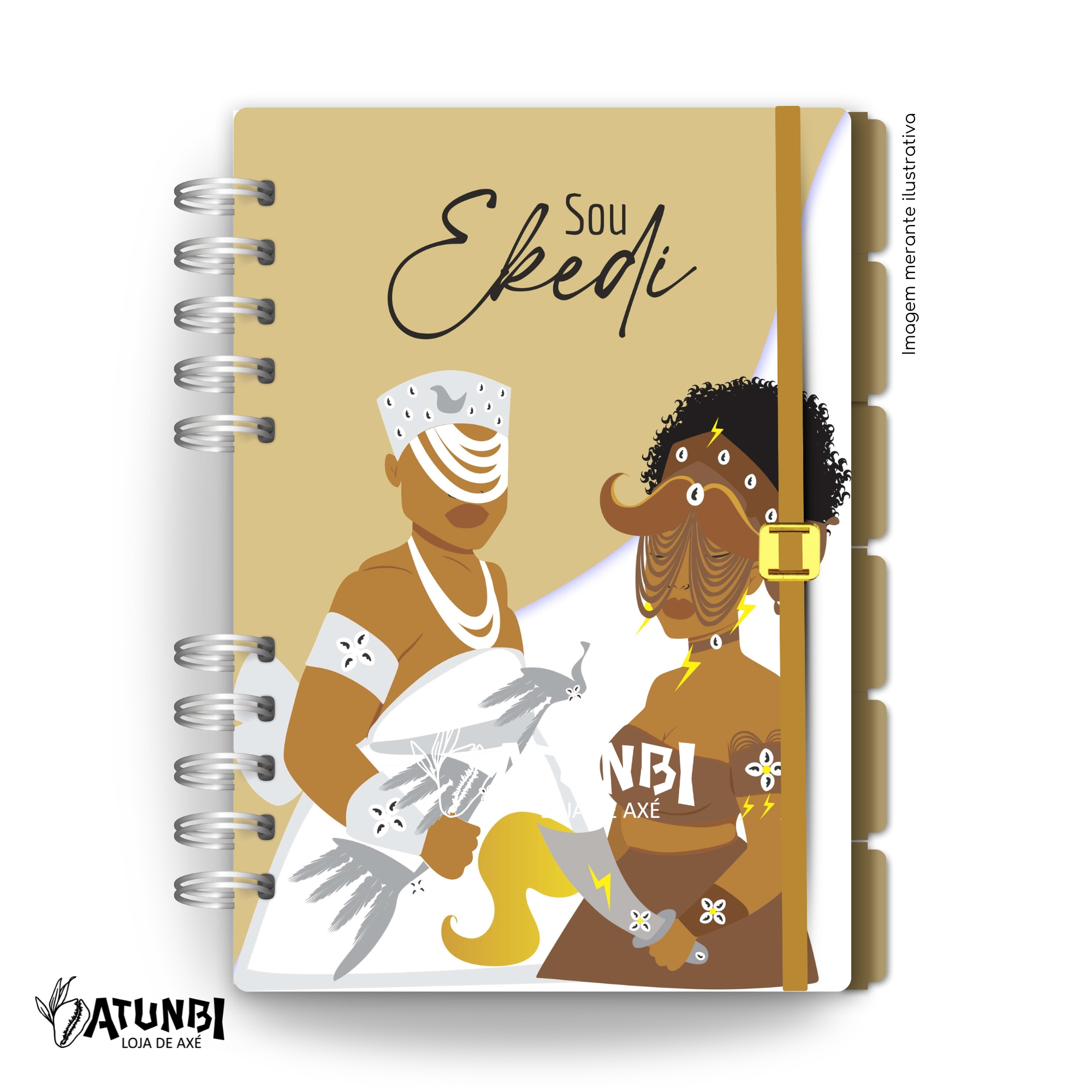 Caderno Sou Ekedi/Makota personalizado, capa com aba transparente e contra-capa dura e laminação fosca, encadernação wire-o, saco canguru plástico, fechamento com elástico e passante em acrílico, divisórias em papel kraft com abas aparentes, totalizando aproximadamente 328 páginas.