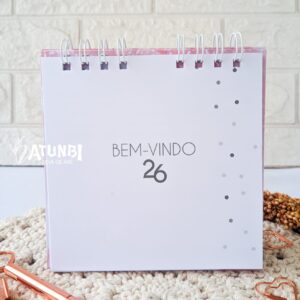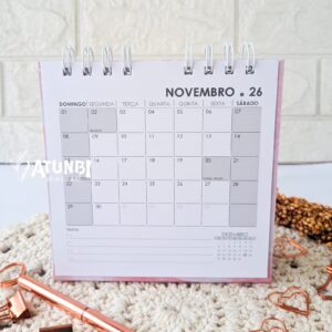 Calendário de mesa pocket – 15x15cm, base dura com laminação fosca, impressão em alta qualidade, encadernação wire-o, folhas offset 150g.