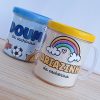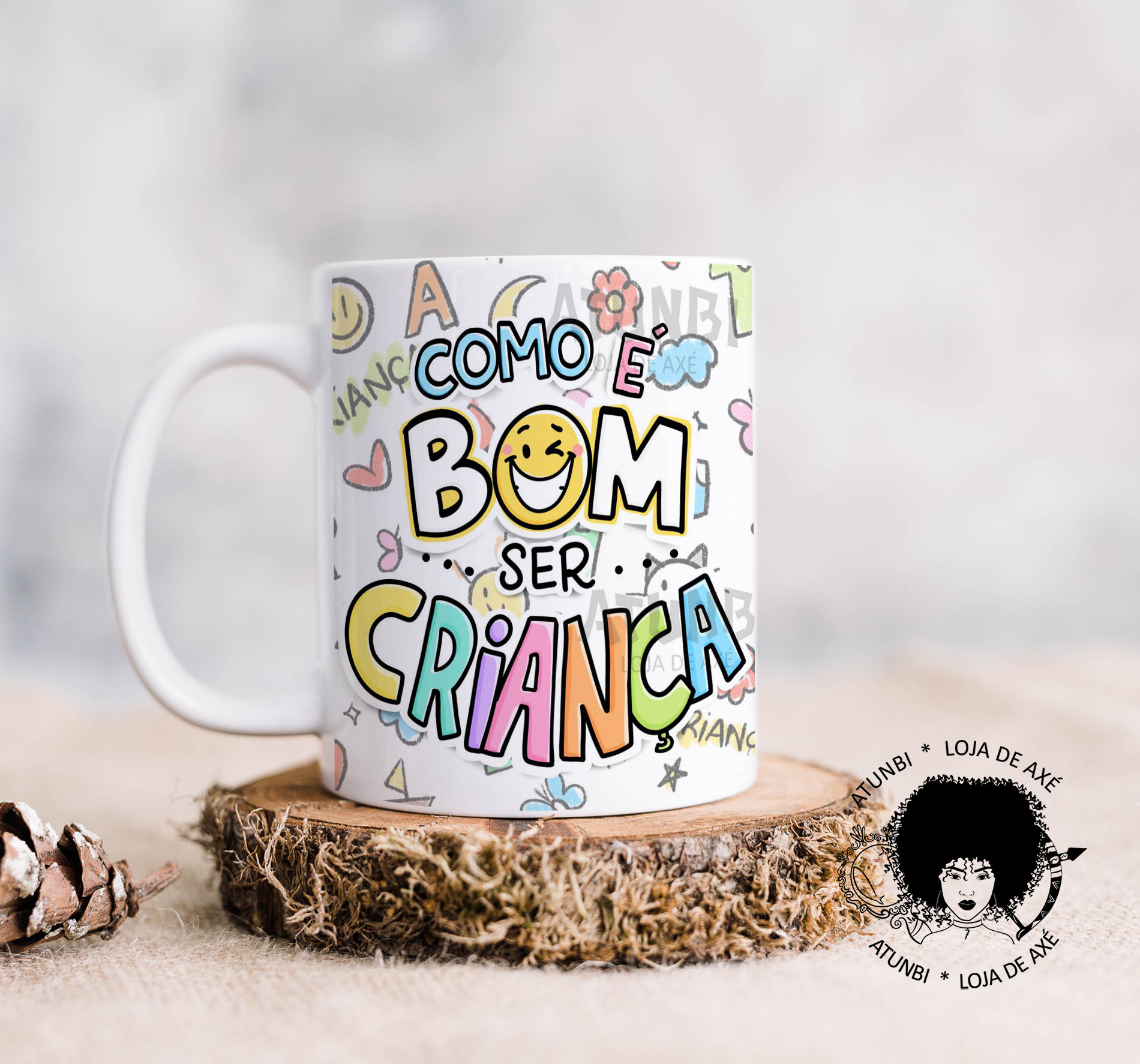 Caneca estampada (sublimada) diretamente no produto, disponível em 2 materiais: