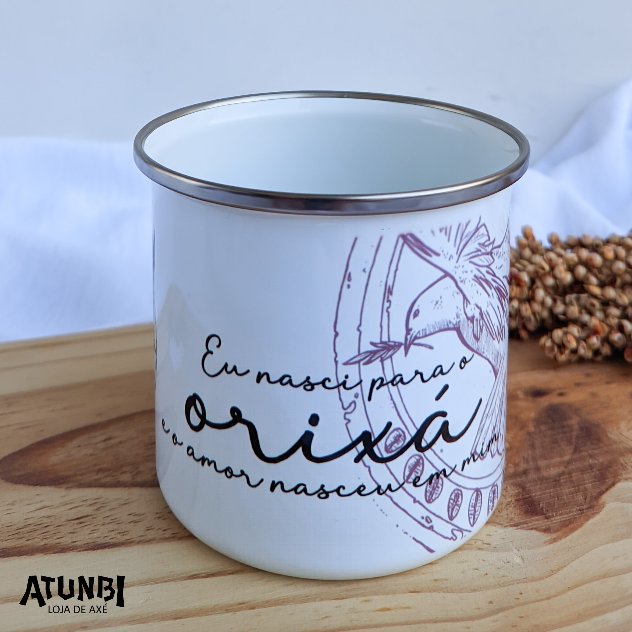 Caneca de alumínio esmaltada branca 300ml de alta qualidade e resistência, com borda metálica.