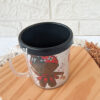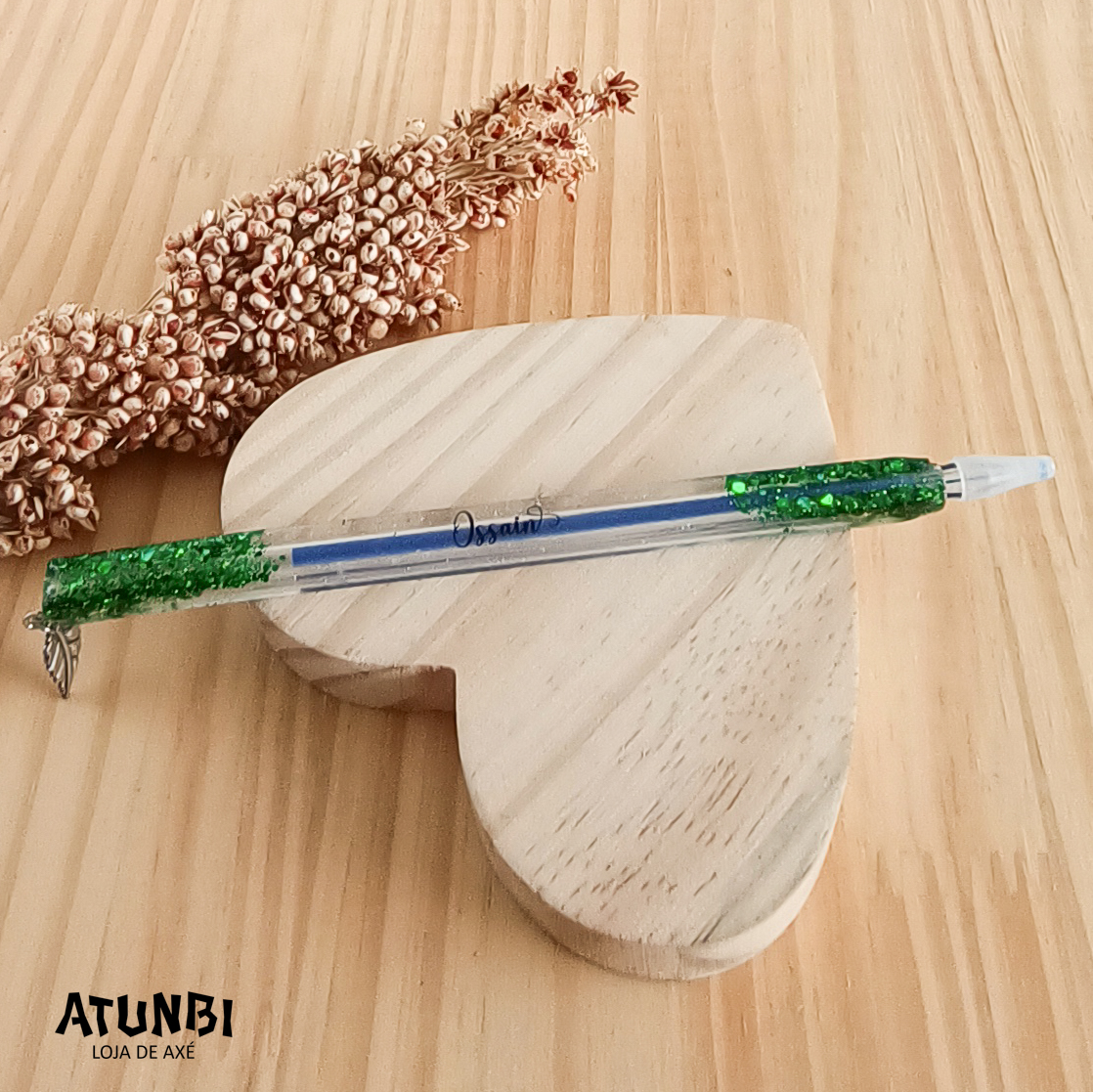 Caneta em resina com personalização em glitter e transparência, acabamento com pingente metálico, escrita na cor azul.