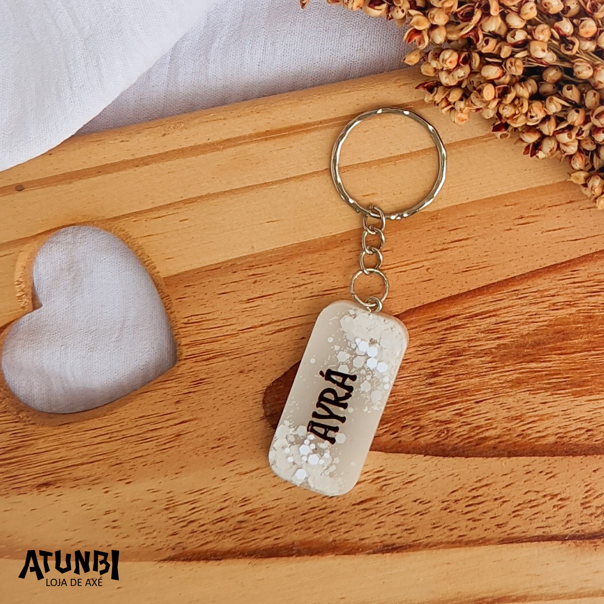 Chaveiro de resina, personalização em branco, glitter e escrita, fechamento com corrente e argola.