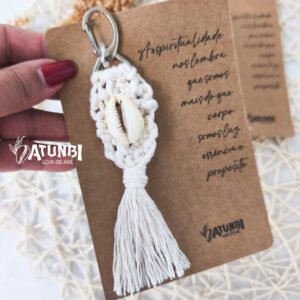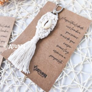 Chaveiro em macramê, búzio natural, fechamento com mosquetão, embalado individualmente com cartão papel kraft e saquinho transparente.