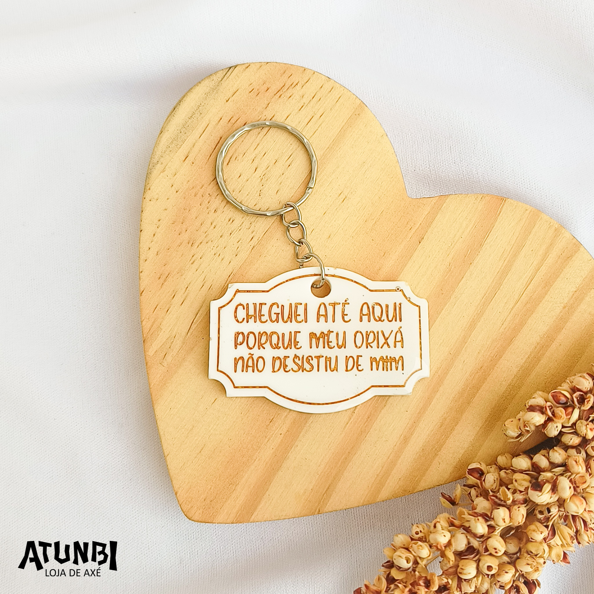 Chaveiro de resina com gravação direta, fechamento com corrente e argola.
