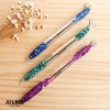 Chaveiro de resina modelo Concha, personalização glitter e efeito metálico, fechamento com corrente e argola, embalado individualmente com cartão e saquinho transparente.