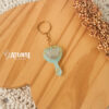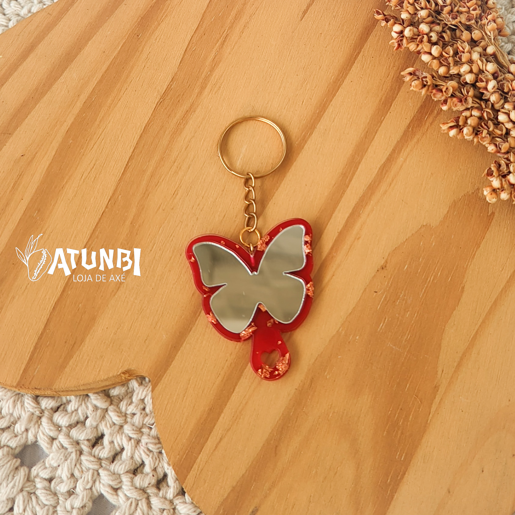 Chaveiro de resina modelo Espelho formato coração, personalização translúcida e efeito metálico, fechamento com corrente e argola.