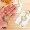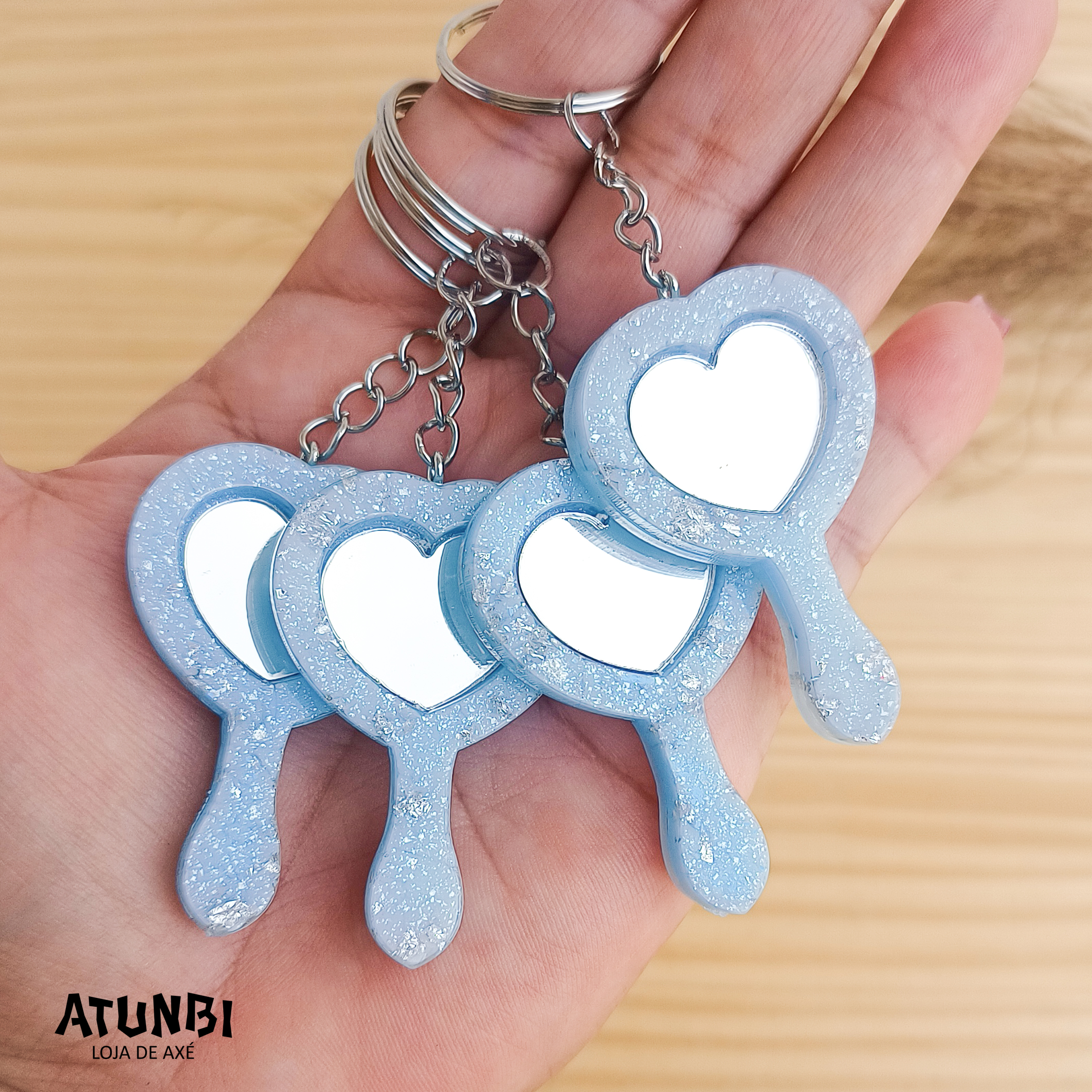 Chaveiro de resina modelo Espelho formato coração, personalização translúcida e efeito metálico, fechamento com corrente e argola.