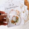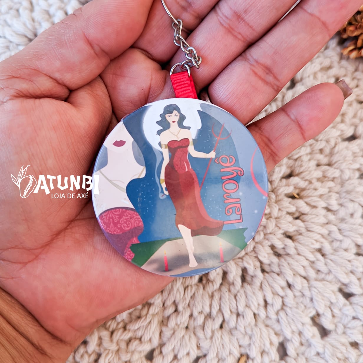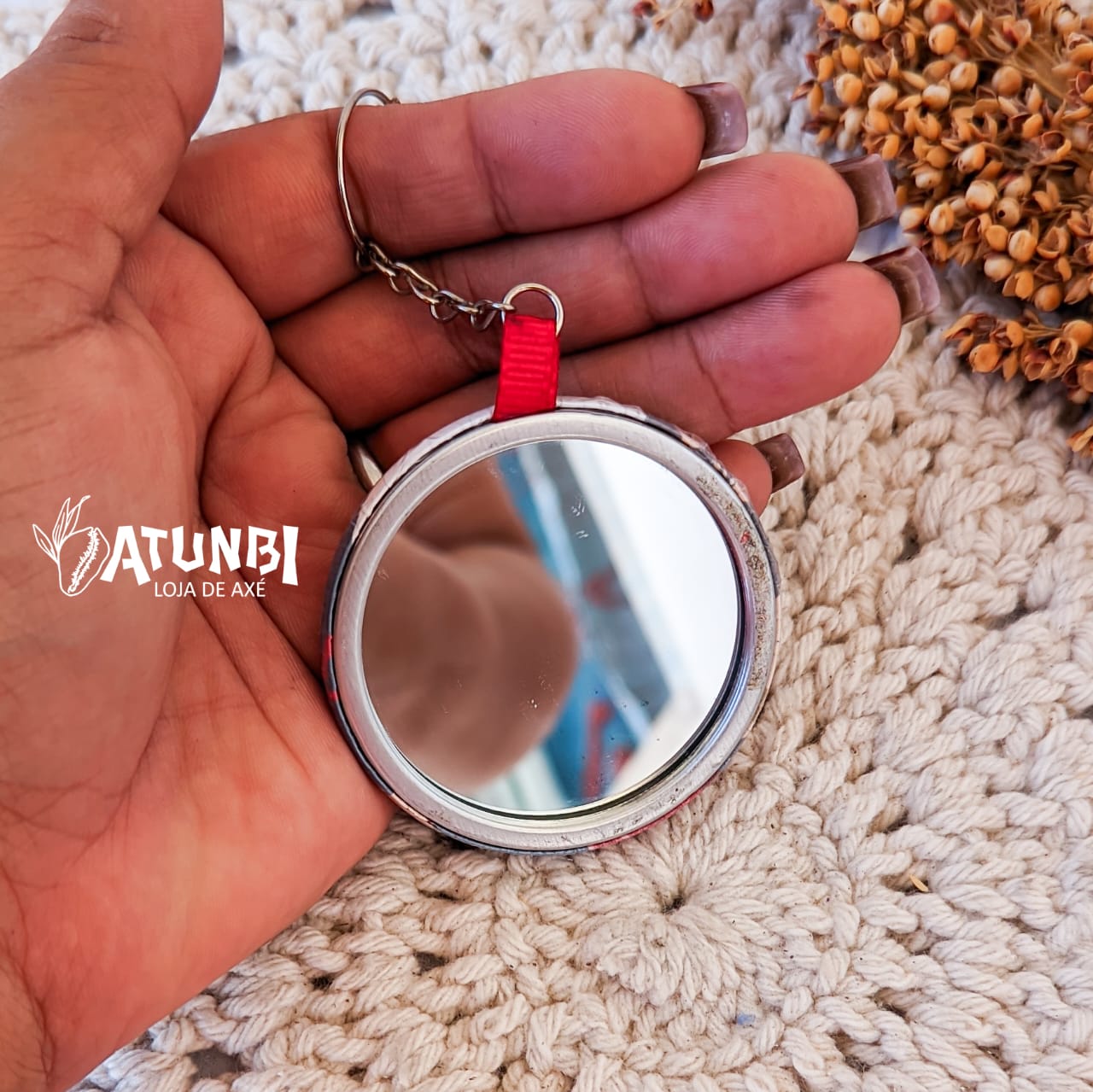 Chaveiro Espelho de bolsa modelo button com argola e corrente, fixado em papel cartão 180g impresso em alta qualidade e embalado individualmente em saquinho transparente.
