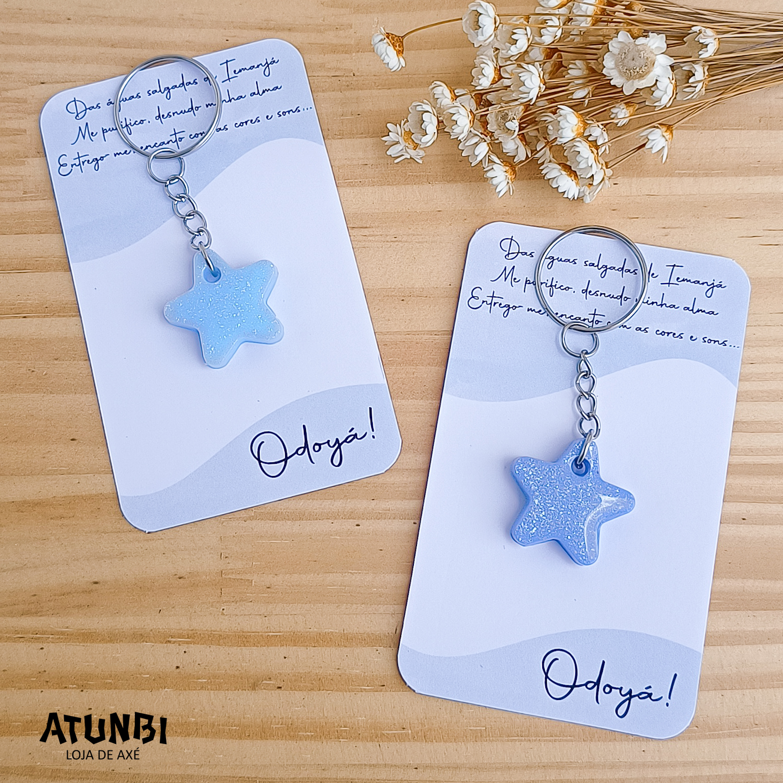 Chaveiro de resina modelo Estrela, personalização glitter e efeito metálico, fechamento com corrente e argola, embalado individualmente com cartão e saquinho transparente.