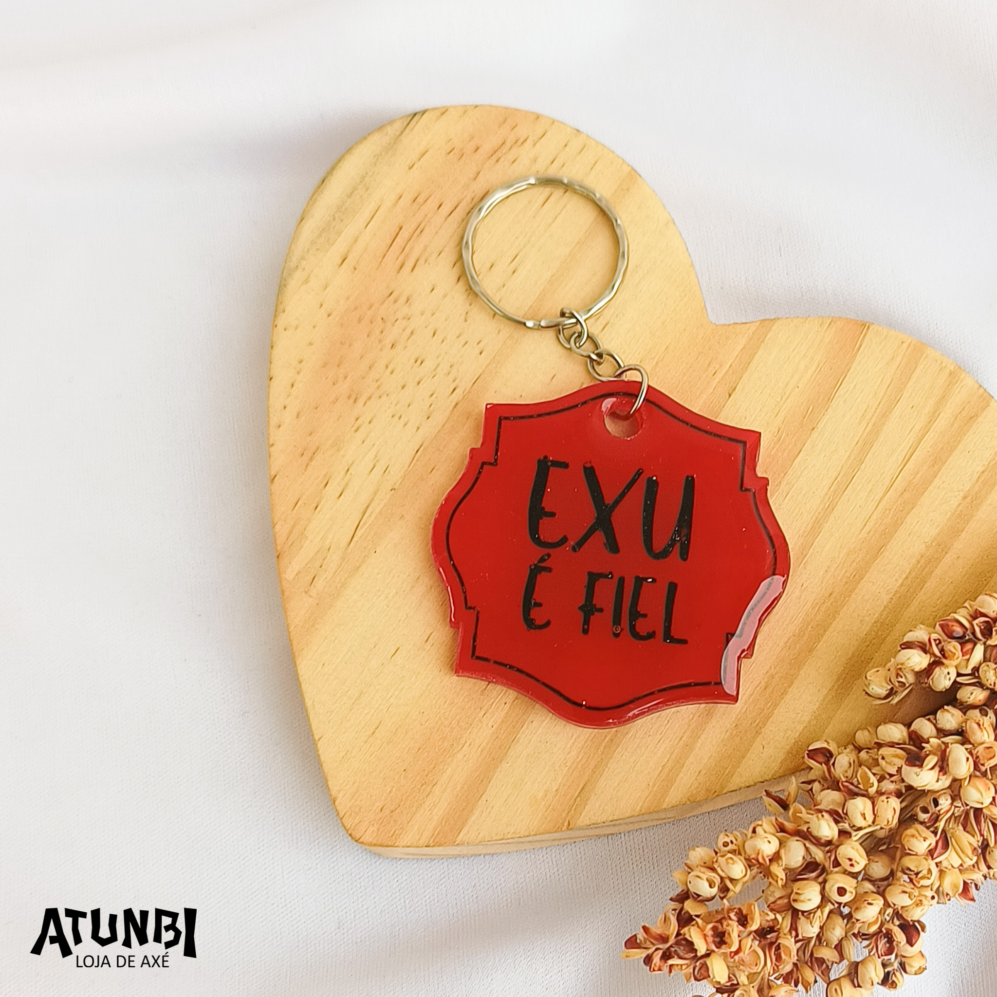 Chaveiro de resina com gravação direta, fechamento com corrente e argola.