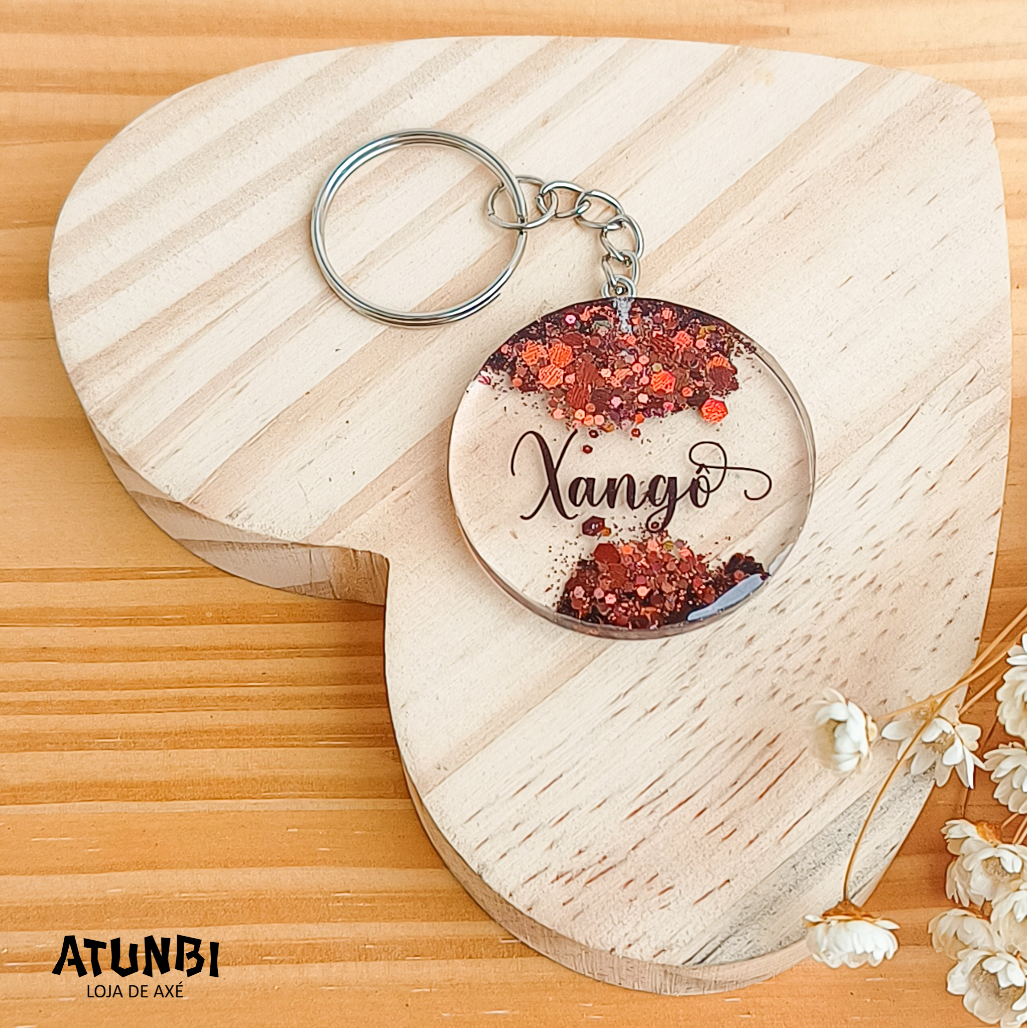 Chaveiro de resina, personalização em glitter e transparência, fechamento com corrente e argola.