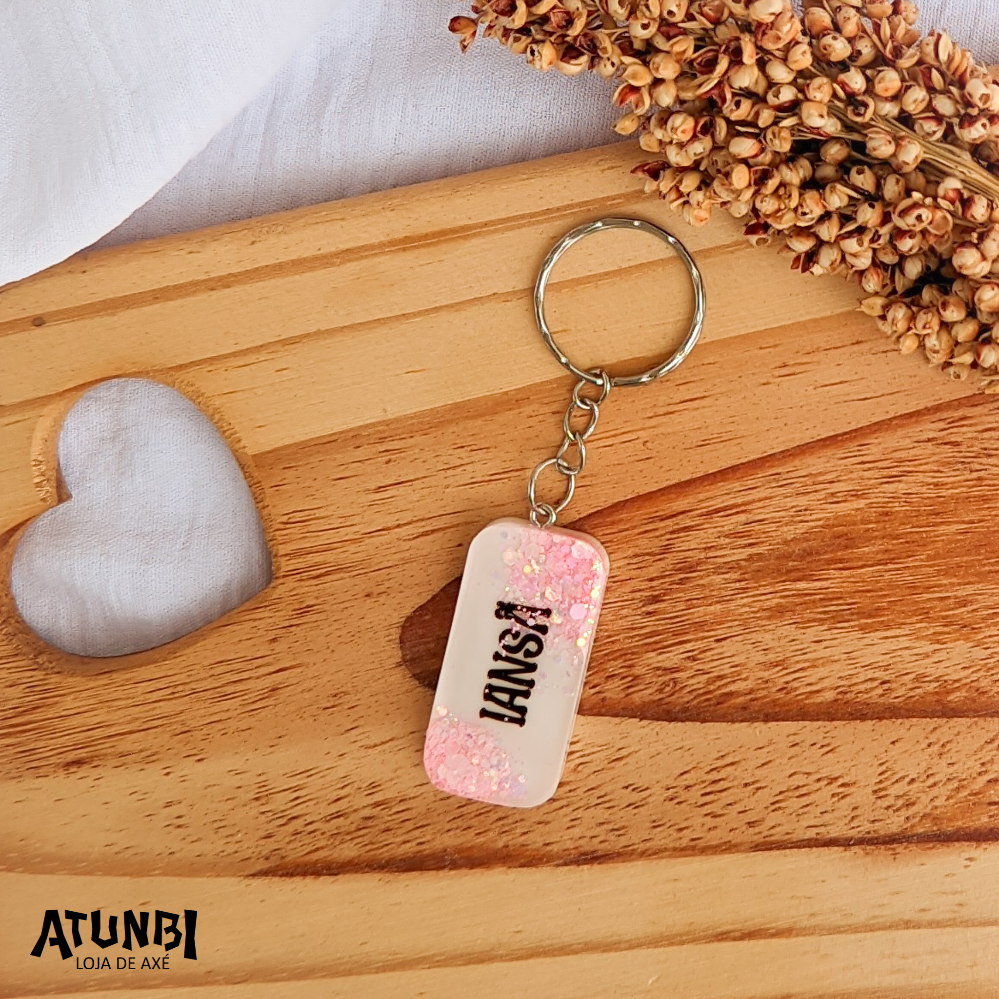 Chaveiro de resina, personalização em branco, glitter e escrita, fechamento com corrente e argola.