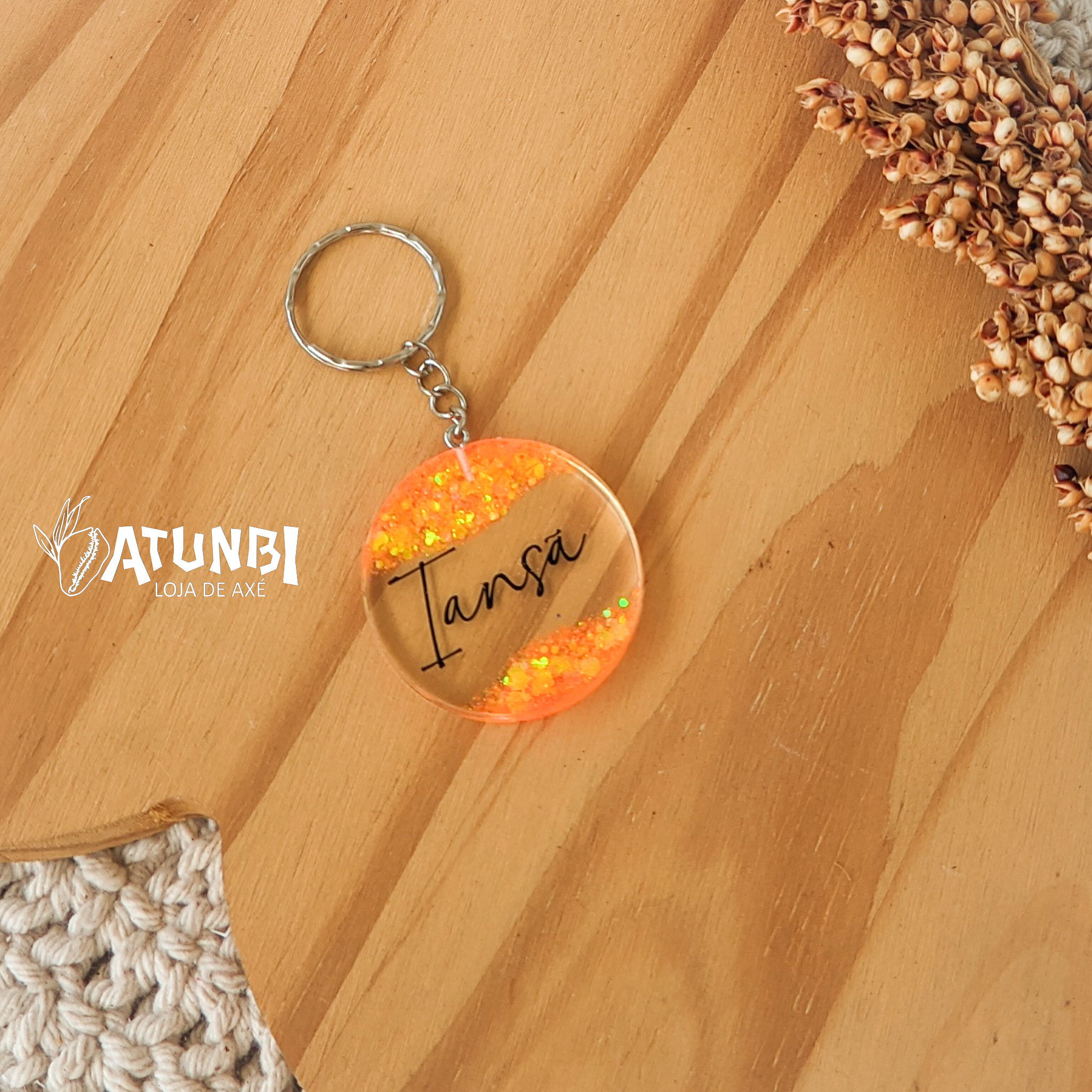 Chaveiro de resina, personalização em glitter e transparência, fechamento com corrente e argola.