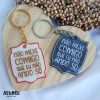Chaveiro de resina com gravação direta, fechamento com corrente e argola.