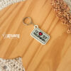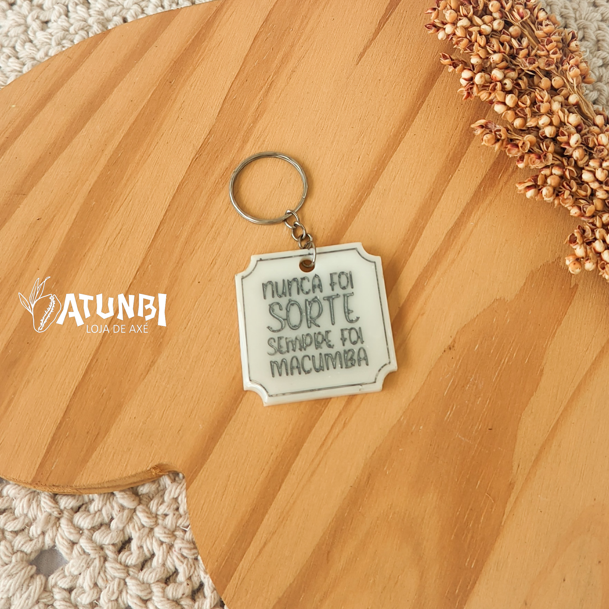 Chaveiro de resina com gravação direta, fechamento com corrente e argola.