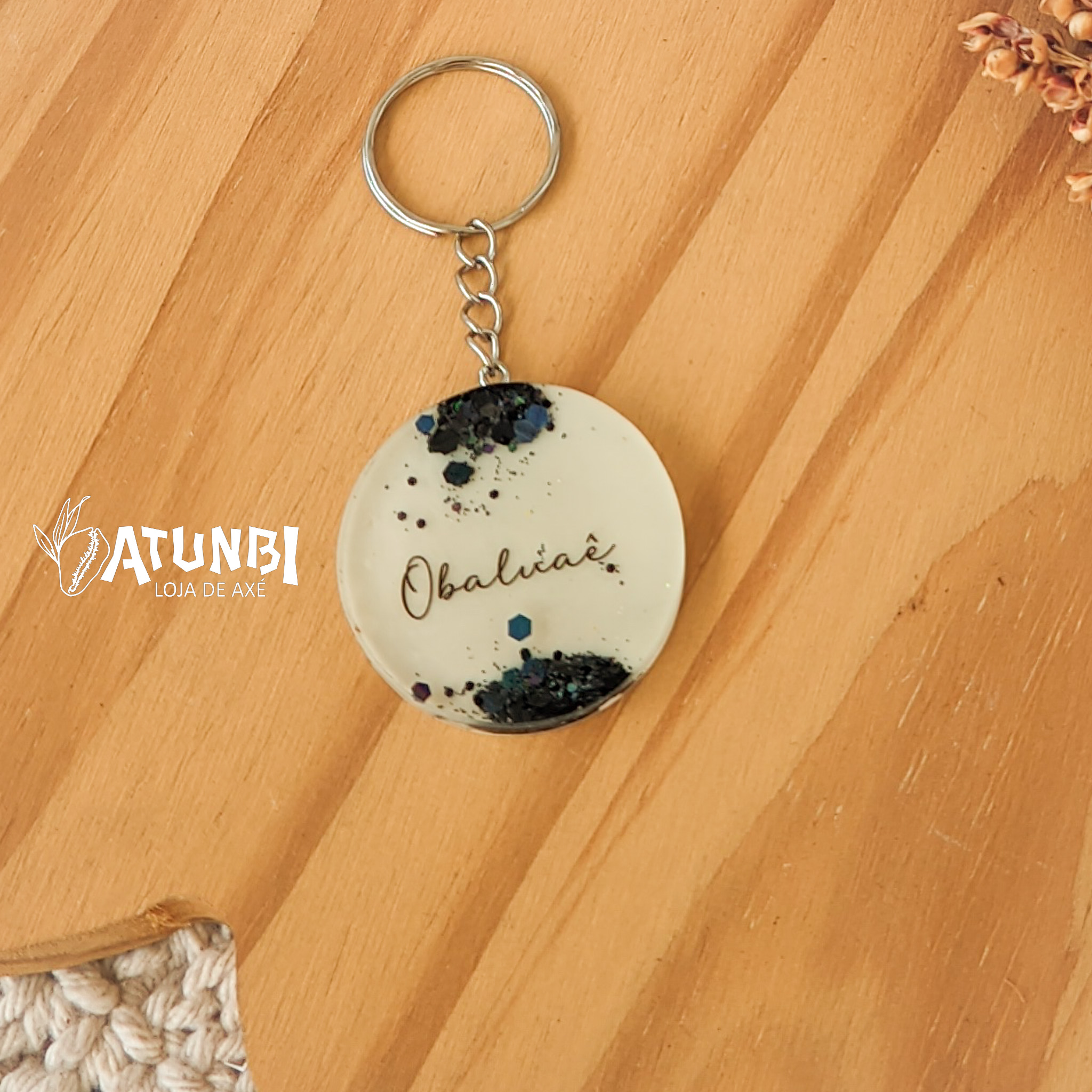 Chaveiro de resina, personalização em glitter e leitoso, fechamento com corrente e argola.