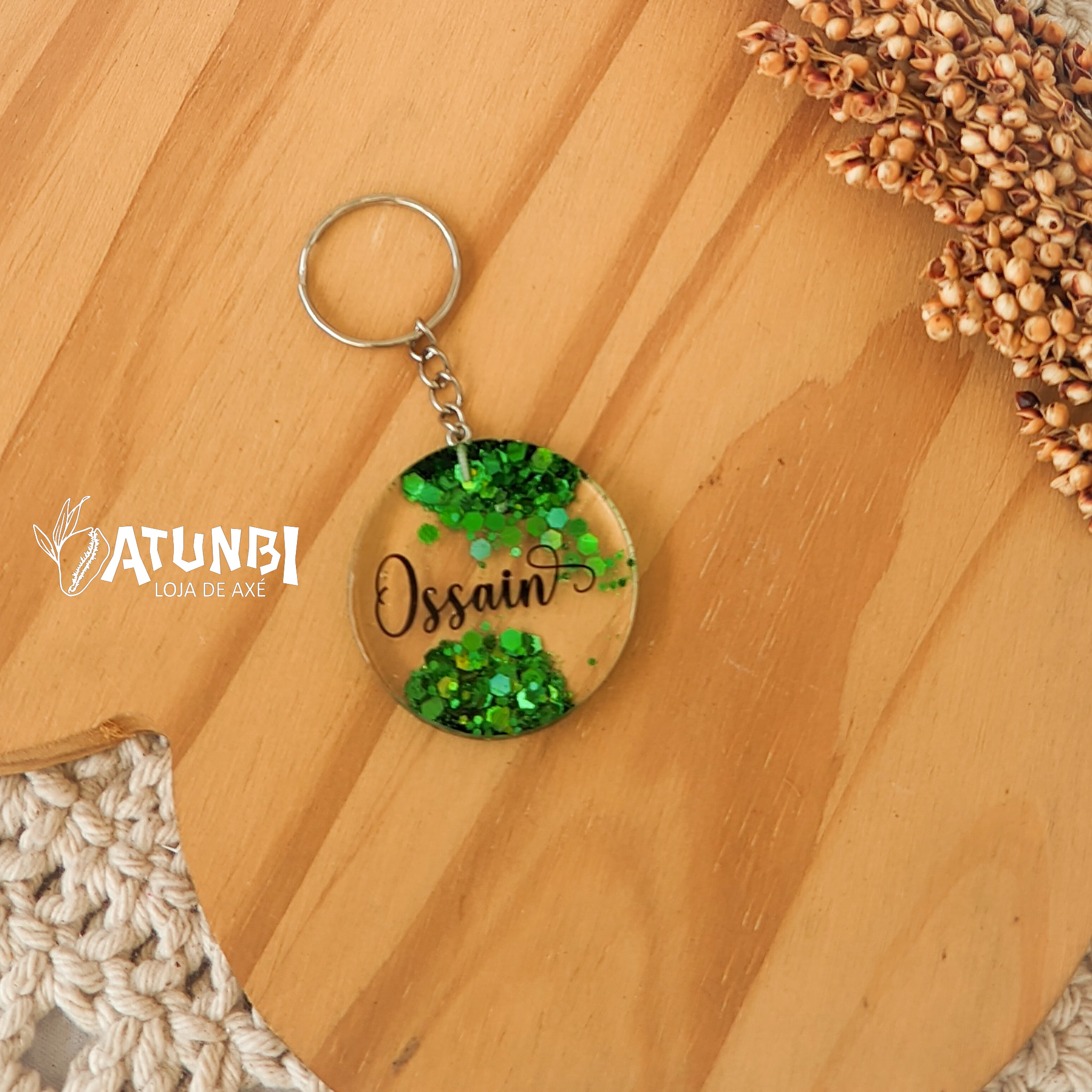 Chaveiro de resina, personalização em glitter e transparência, fechamento com corrente e argola.