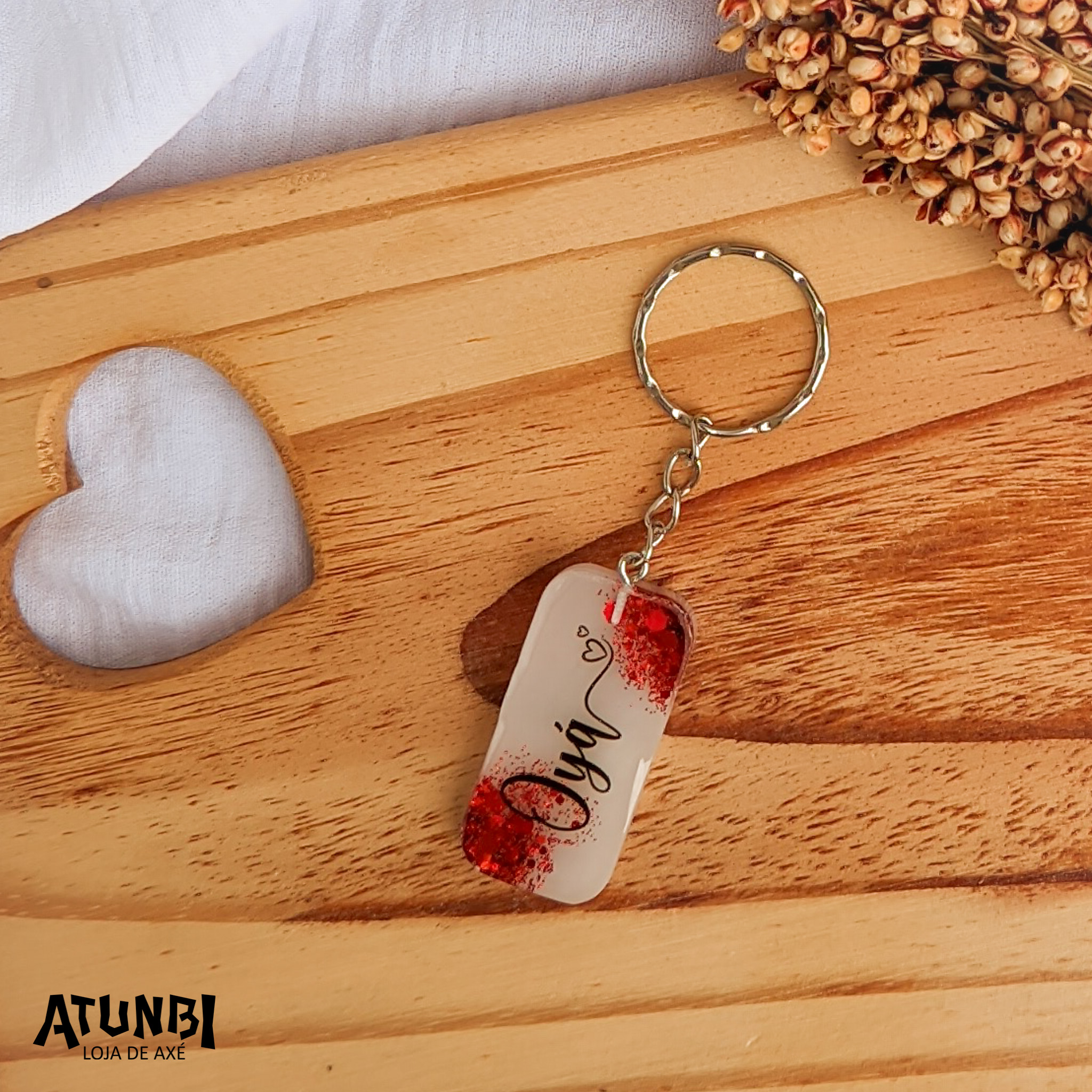 Chaveiro de resina, personalização em branco, glitter e escrita, fechamento com corrente e argola.