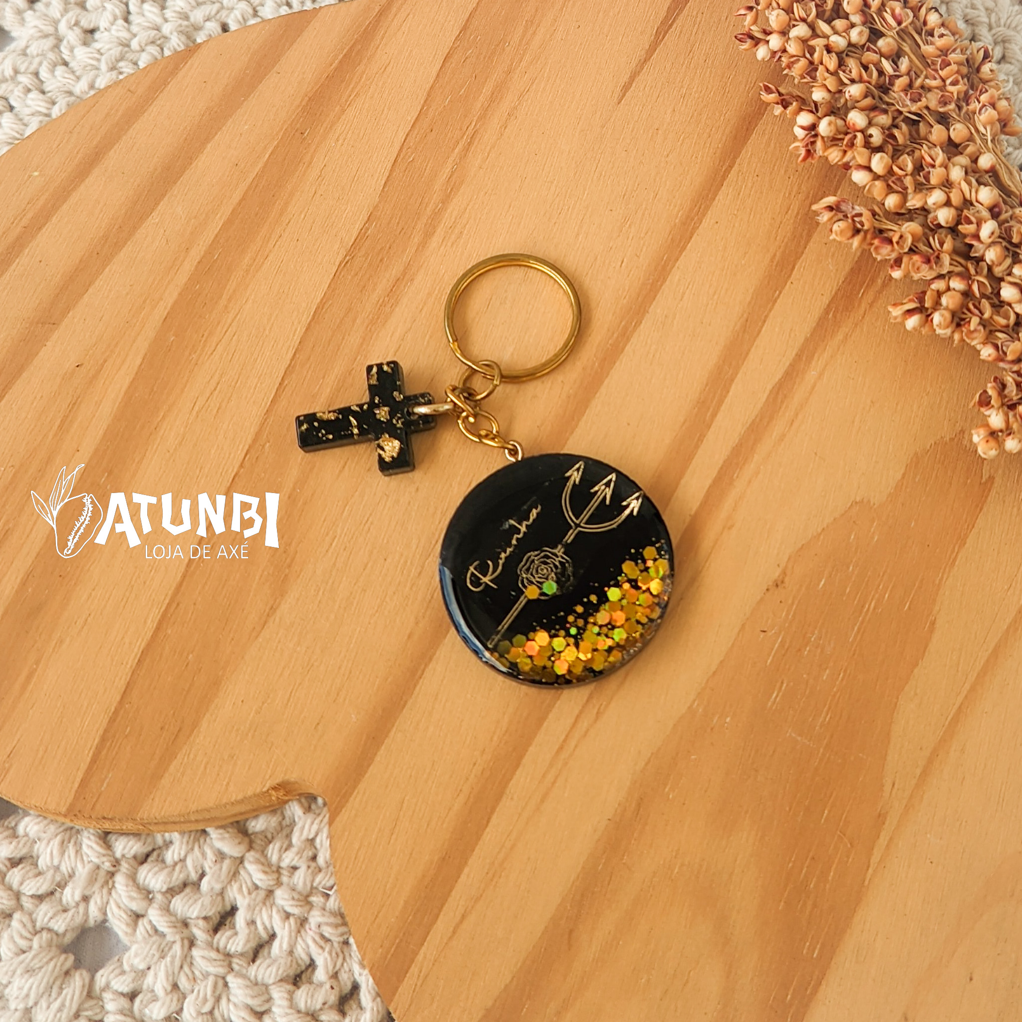 Chaveiro de resina, personalização em preto e glitter, pingente, fechamento com corrente e argola.