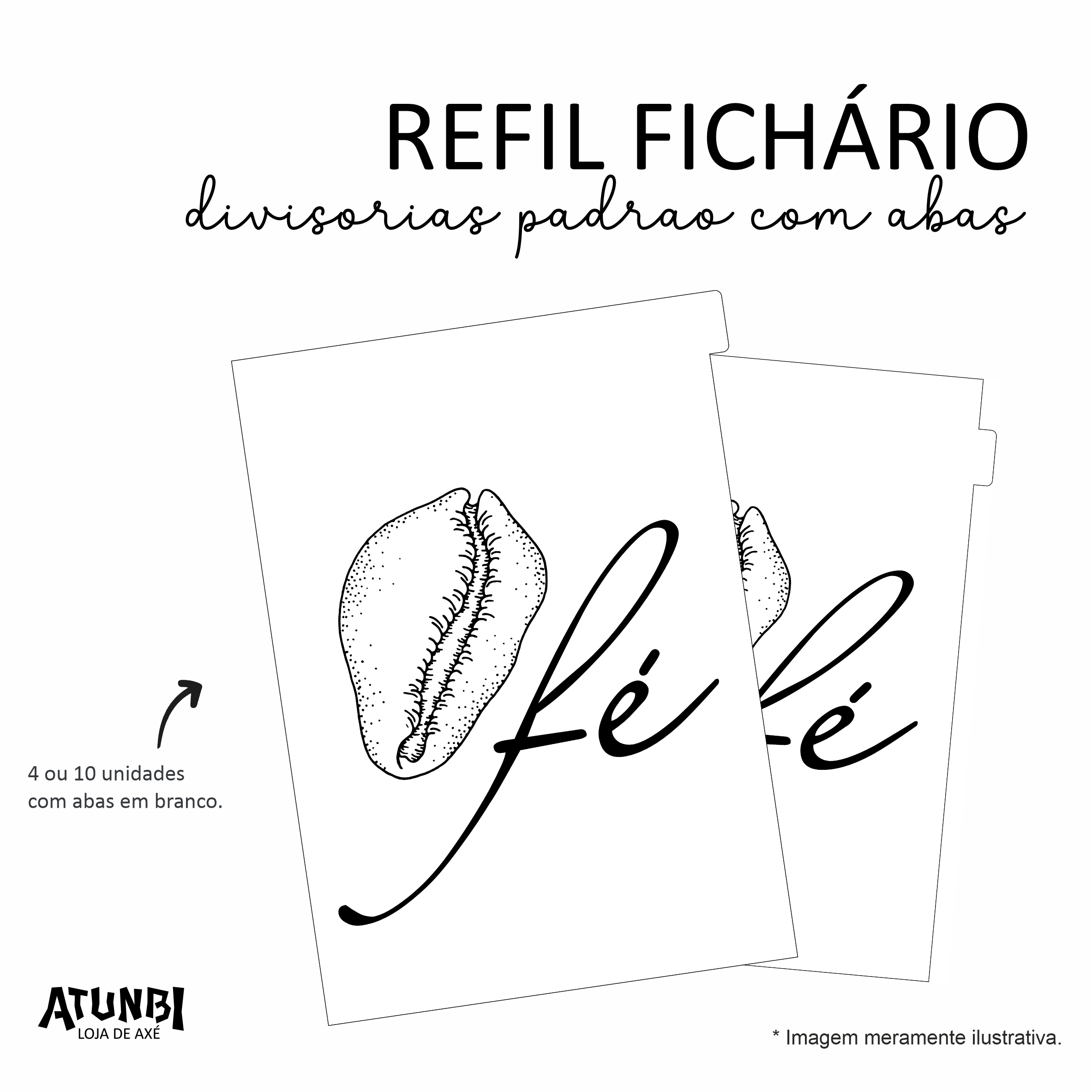 Divisórias Padrão com aba, tamanho A5 (21×15 cm), impresso em papel offset 180g, furação compatível com fichário 4 garras contendo disponível em 4 e/ou 10 unidades.