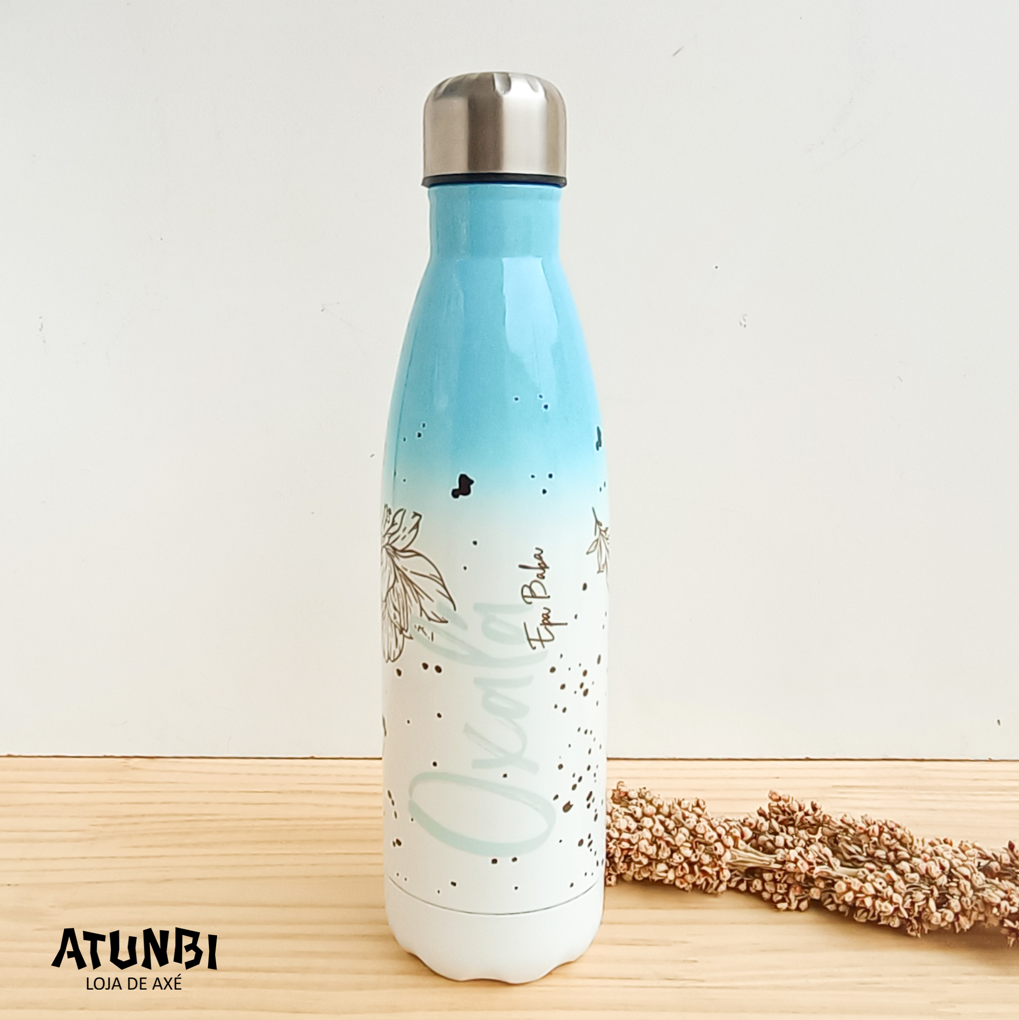 Garrafa térmica 500ml estampada (sublimada) diretamente no produto, mantendo a temperatura por até 12h.