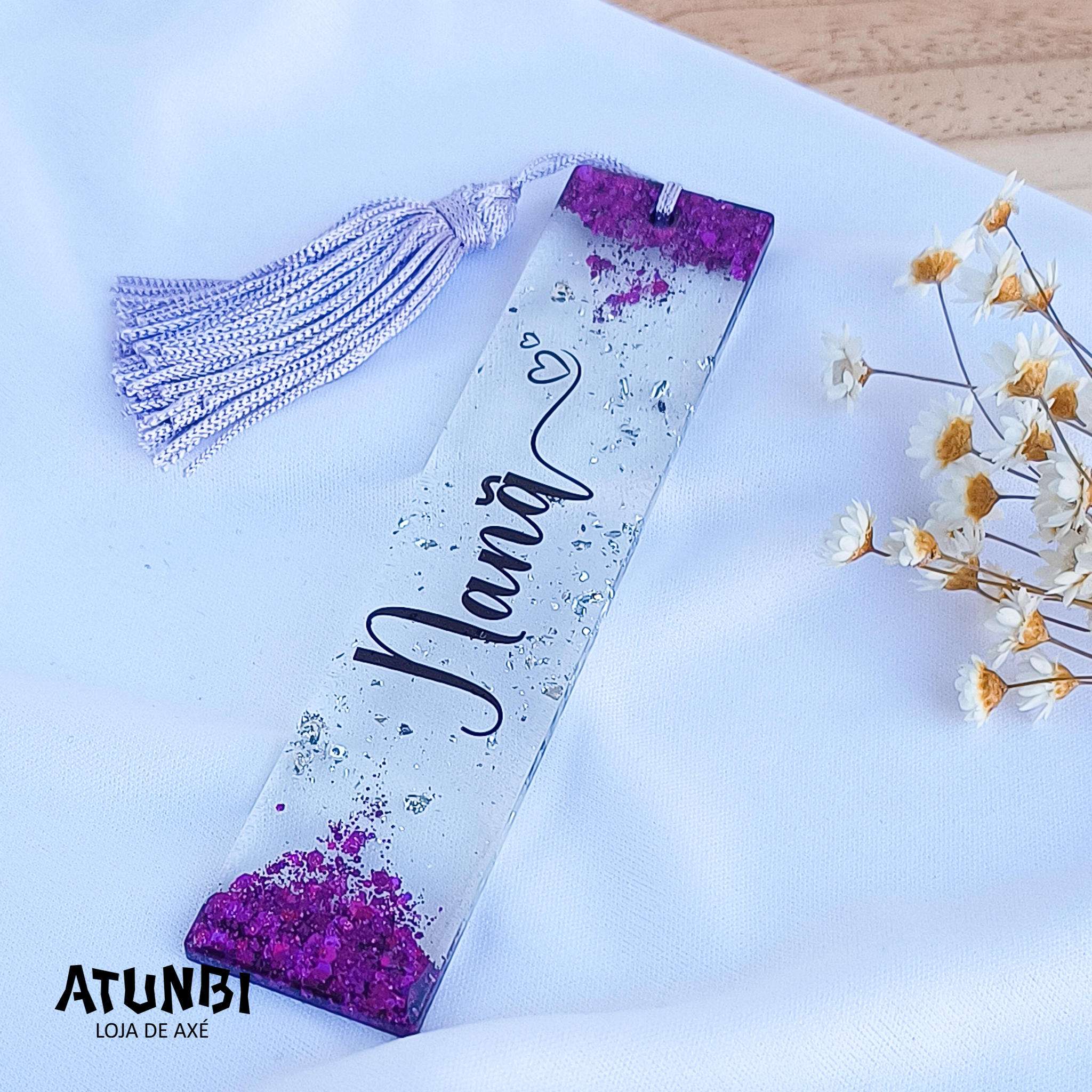 Marca página de resina personalização em glitter e transparência, acabamento com tassel.