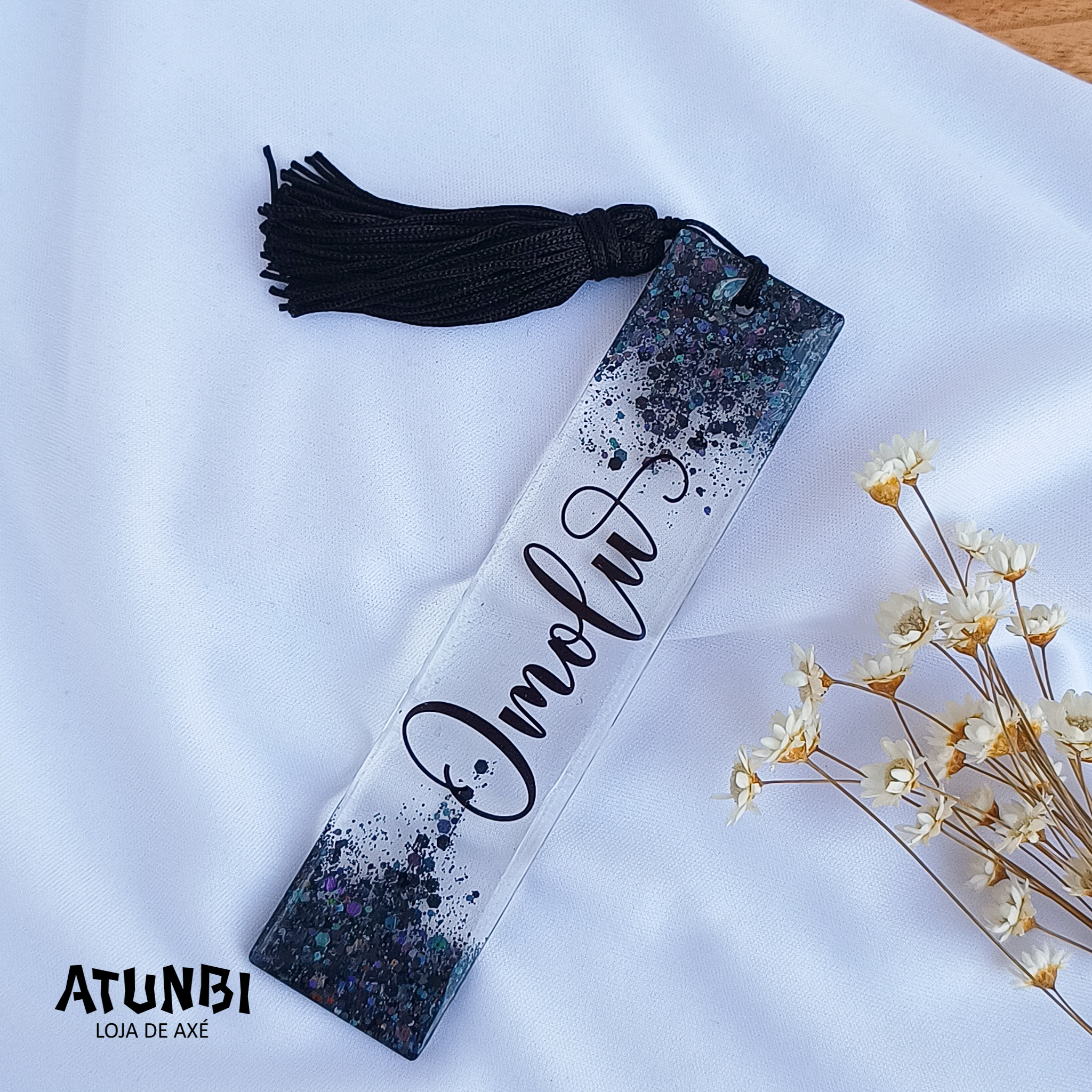 Marca página de resina personalização em glitter e transparência, acabamento com tassel.