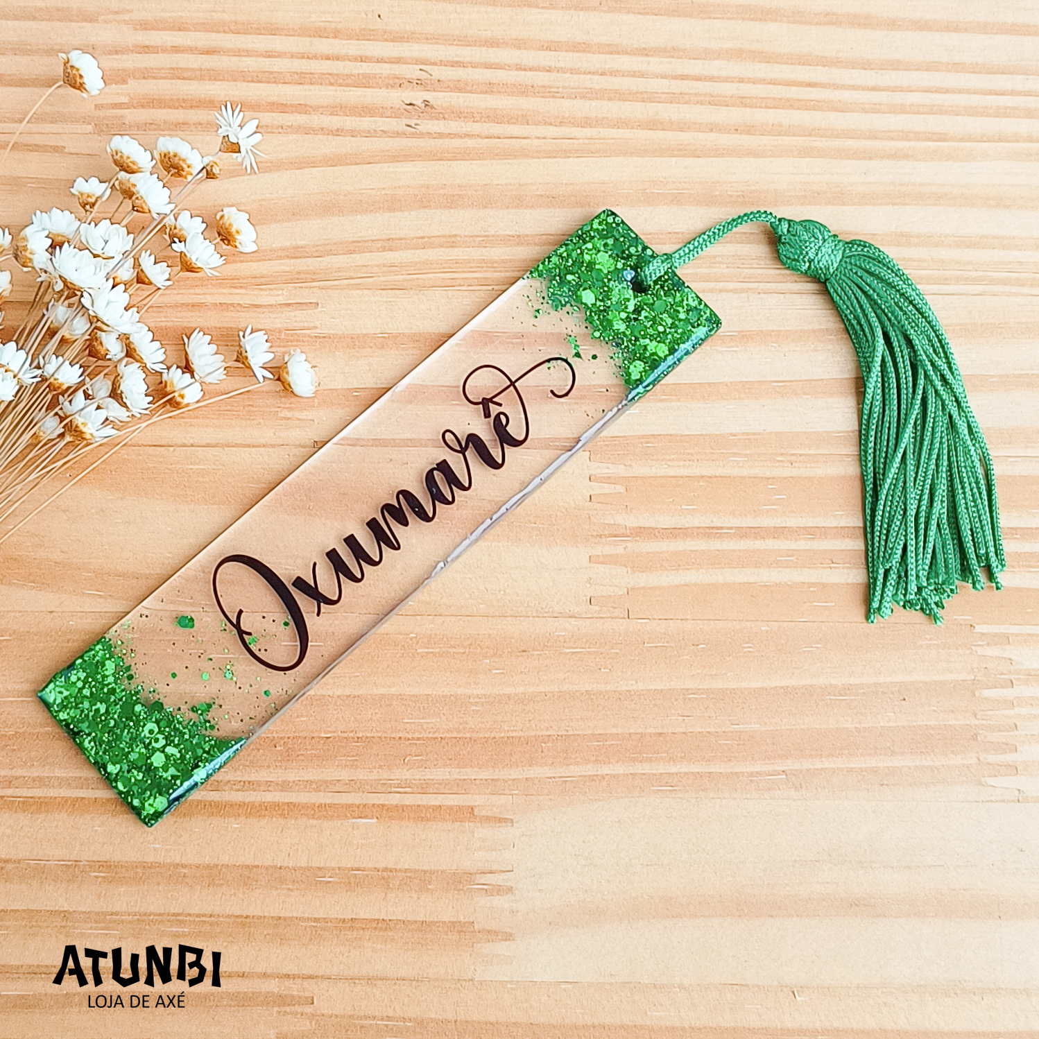 Marca página de resina personalização em glitter e transparência, acabamento com tassel.