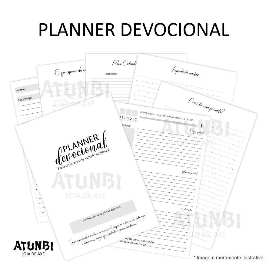 Planner Devocional 22x16cm, impresso em papel 90g, sendo 1 dia/página, capa e contra-capa dura e laminação fosca, fechamento com elástico e passante em acrílico, bolso duplo de papel, bolso canguru plástico, encadernação wire-o, totalizando 380 páginas.