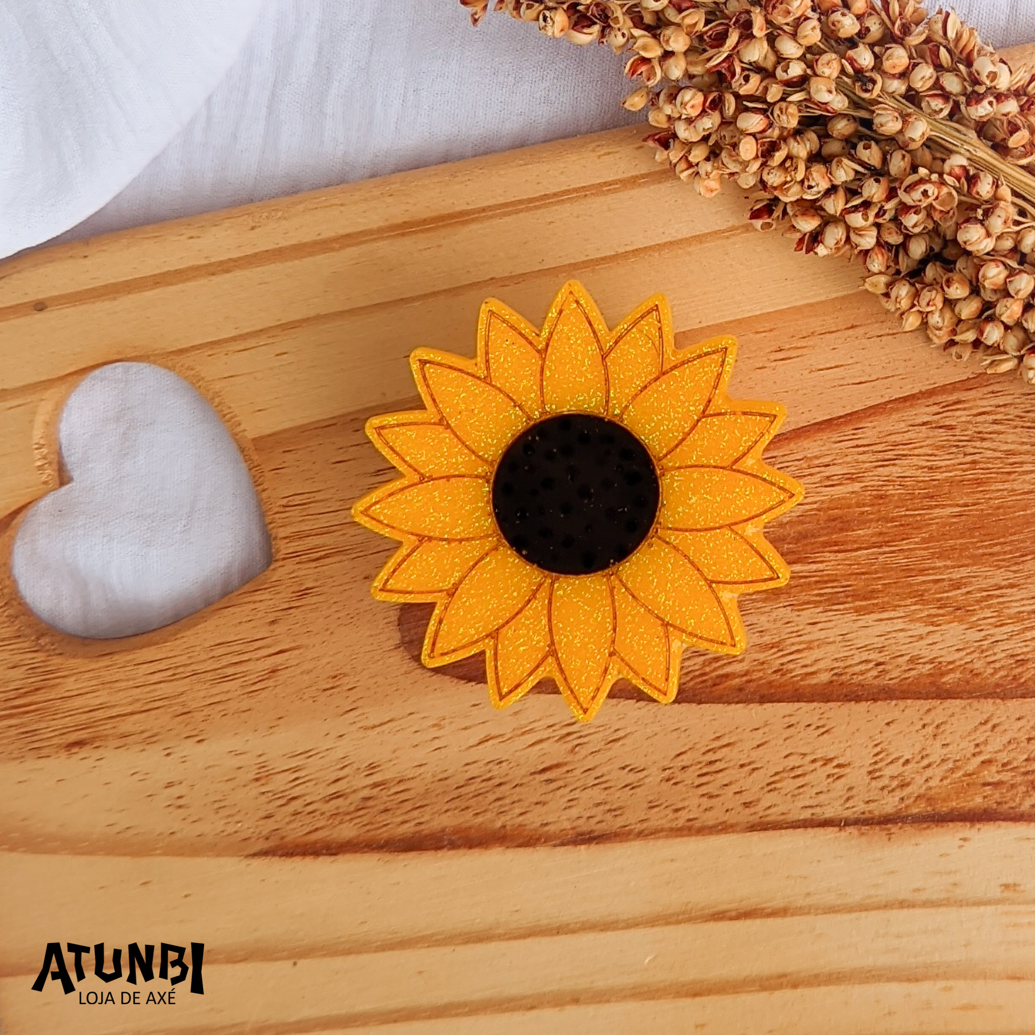 Suporte plástico para celular, personalizado com aplique de resina modelo Girassol.